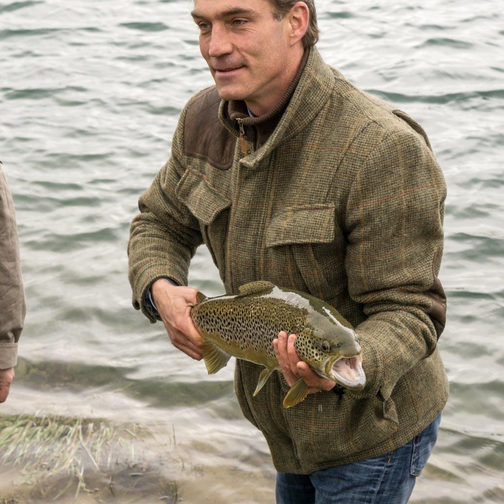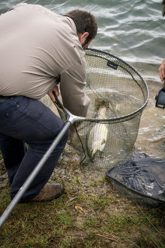 There were a lot of anglers fishing the lake but I noticed a few spots available outside the fishing lodge. The guys were keen to make a start so I got them all casting with different fishing methods and before I could pop back out to the car to put on my wellies Pieter was into a good fish. It turned out to be a cracking brown trout. What a start! A beautiful fish with a lovely golden hue to it.