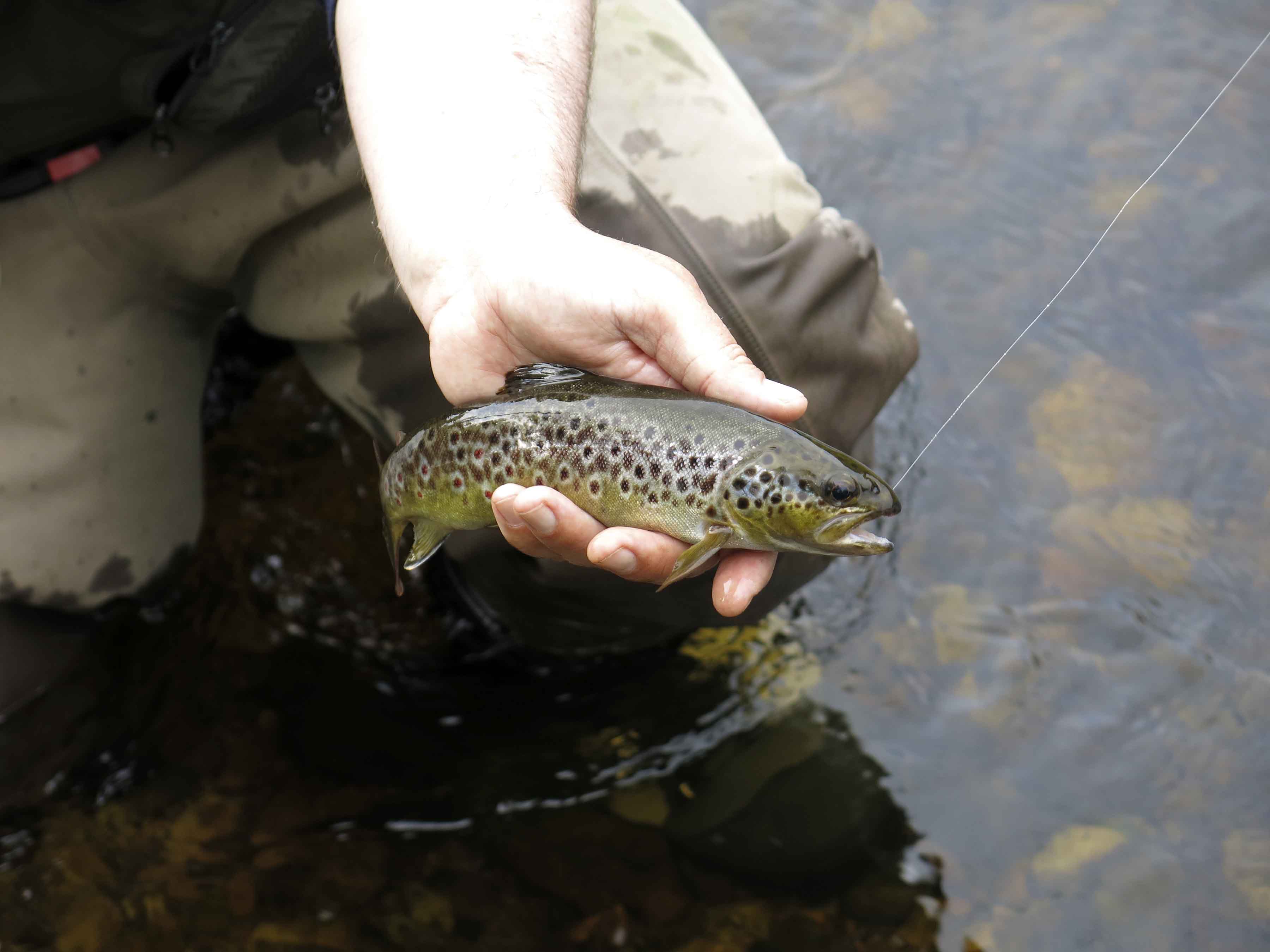 After the fair closed, I nipped down to the river with Brian and Ken and spotted some nice wild browns rising. I tackled up with a dry olive pattern of mine and waded out. I managed to land 7 lovely trout in less than an hour and lost a few more including two about 1.5lbs. It was somewhat inevitable when I was trying to get them back across the current to the guys on the shore to get a photo. We did manage one nice video clip of a fish approximately .75lbs going back.