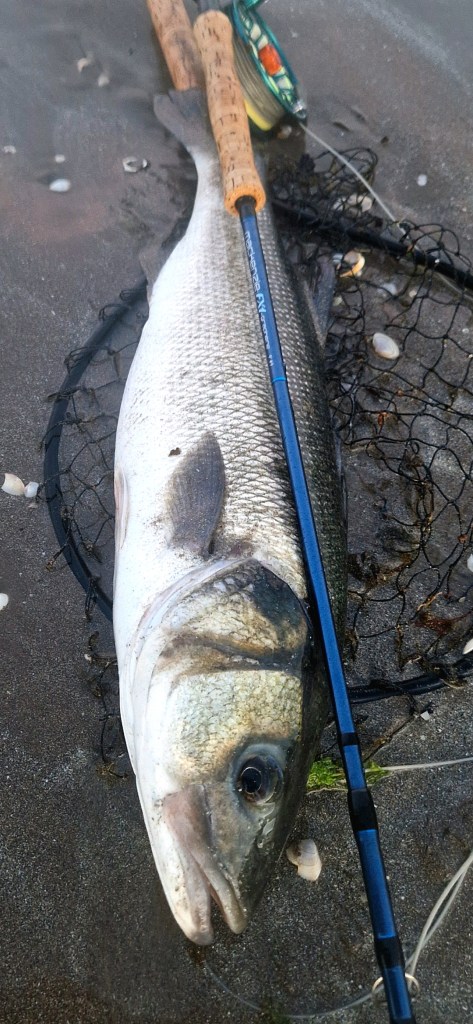 In early September, the bigger bass made an appearance, and we had an evening with top-notch conditions, a big evening tide with high pressure and little wind. I headed to a mark with a big bass on fly in mind. The conditions gave me confidence, but after a few small schoolies, doubts crept in. Just then, as darkness approached and the tide started to turn, I had a strong take. YESSSS, it was big. I landed the fish after a tough battle, which measured 68cm (almost 8lbs). I took a quick photo and released the fish to fight another day.