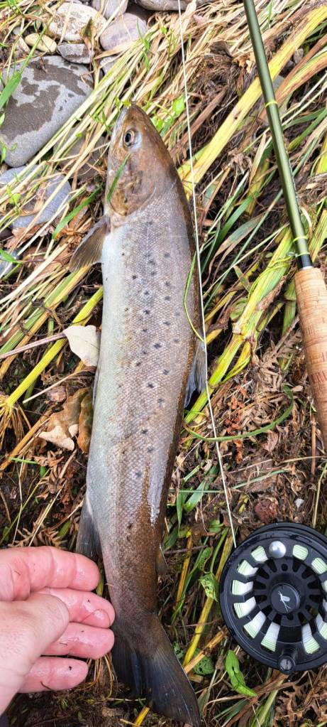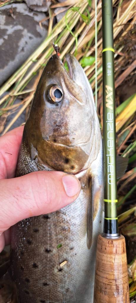 The rain persisted with a lot of flooding forcing us to target the smaller streams for trout on fly. Streamers in heavily coloured water and nymphs as it cleared was our approach. You never know what will happen, as we had some grilse take the nymphs, with Krys landing one on the Mackenzie NX1 3wt.